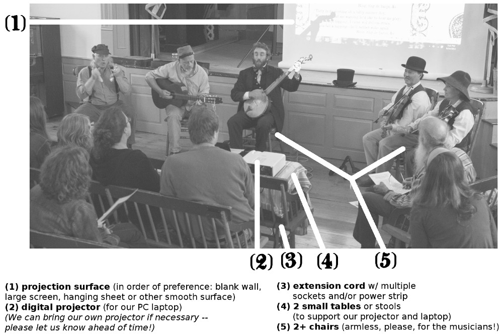 - Fair lighting in audience area (they may want to read from some song sheets) and one performers (to show instruments, costumes, &c.)… But lights should be DIM (or off) around the projection surface.