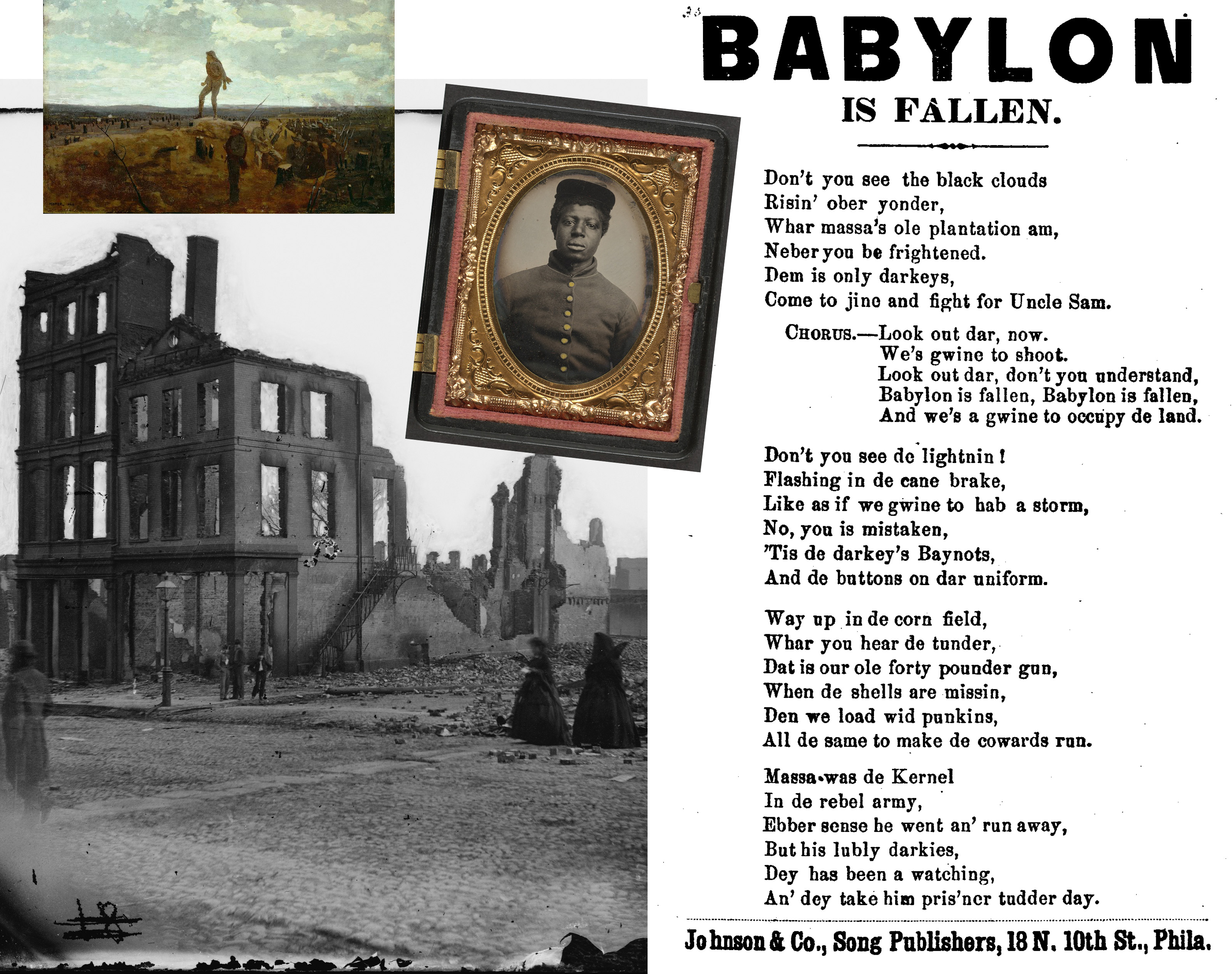 Our singalong discussions, concerts, and school residencies all include rich historical visual materials from the Civil War era. Below, you can see a few of our original montages, which combine several types of primary source materials (such as 19th century songsheets, archives of daguerreotypes & photographs, firsthand accounts, poems, &c.) with YOUR observations, questions, and singalong voice: